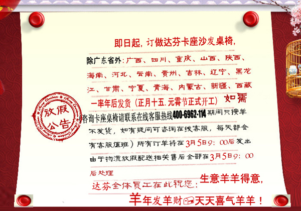 即日起,订做达芬卡座沙发桌椅,除广东省外:广西、四川、重庆、山西、山东、陕西、海南、河北、云南、贵州、吉林、辽宁、黑龙江、甘肃、宁夏、青海、内蒙古、新疆、西藏、等等省市,一率年后发货(正月十五.元霄节正式开工)如需咨询卡座桌椅请联系在线客服热线400-6962-114,期间只接单不发货,如有疑问可咨询在线客服,每天都会有客服值班)所有订单将在3月5日9:00发出由于物流放假配送,相关售后全部在3月5日9:00后处理。