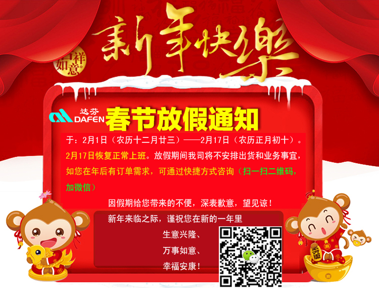 尊敬的客户: 新春伊始,万象更新。广州达芬家具有限公司全体员工在此深深感谢您长期以来对我司的支持与厚爱!向您致以诚挚的祝福和问候!在新的一年里,我司会更加努力,给您提供更好的服务!