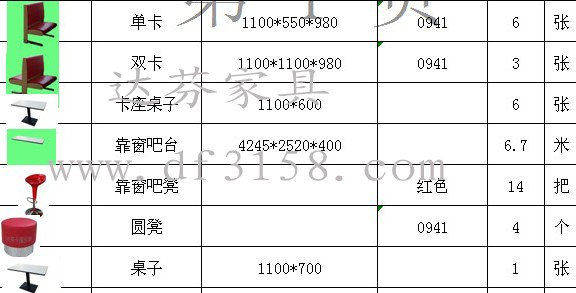 内蒙古呼和浩特郭总采购该批卡座沙发桌椅数量分别是:6张单卡 3张双卡 6张卡座桌子 6.7米靠窗吧台 14把吧凳 4个圆凳 1张桌子
