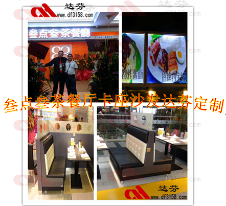叁点叁茶餐厅卡座沙发桌椅,点餐灯箱,垃圾箱达芬家具定制。叁点叁茶餐厅地址:广州荔湾区德星路9号荔湾广场南塔D座4楼4D2铺(近上下九)