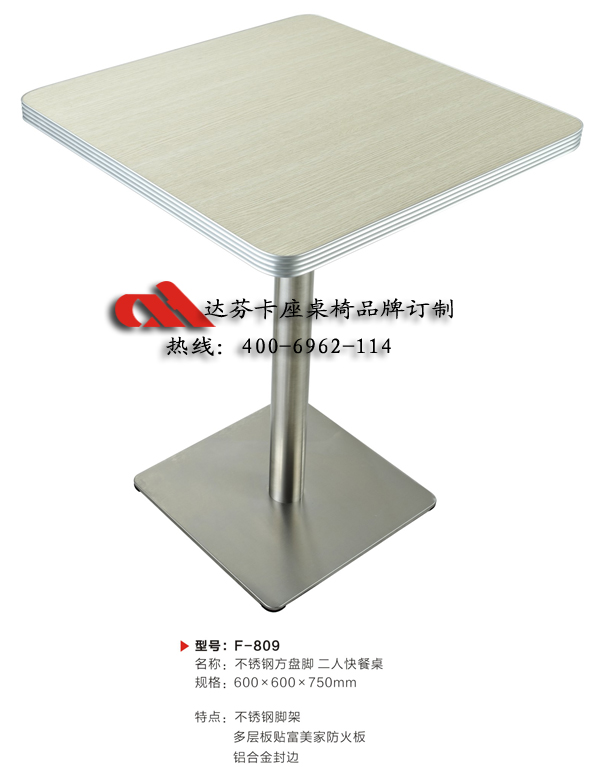 材质:F-809 不锈钢方盘脚 二人快餐桌。不锈钢脚架 多层板贴富美家防火板 铝合金封边