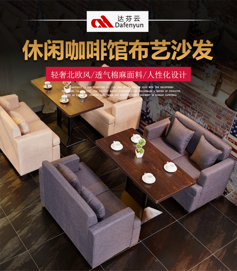 适用于咖啡店、连锁餐厅等??休闲咖啡馆布艺沙发?达芬家具订制电话400-6962-114