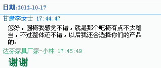 2012-10-17日回访甘肃“香慧干汁麻辣烫”李女士表示:您好,圆椅我感觉不错,就是那个吧椅有点不太稳当,不过整体还不错,以后我还会选择你们的产品的。