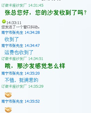 广西南宁张总是经营巴顿餐厅的,南宁张总通过网站www.df3158.com 了解到达芬定做餐厅卡座沙发,并通过QQ联系,于2月26下单定做了8张二人卡座沙发。工期一个星期就收到货了,如下是达芬卡座沙发客服售后跟进情况: