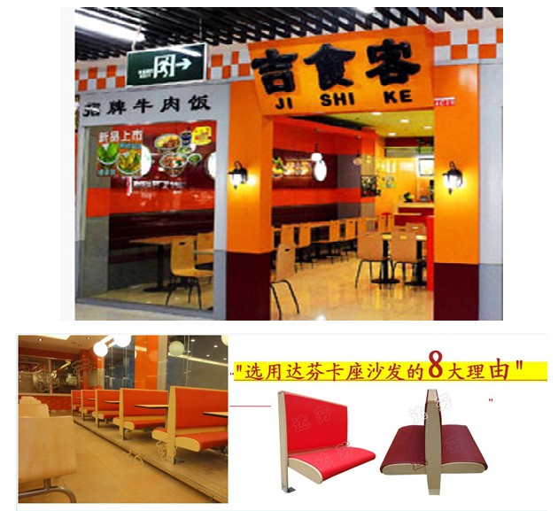 浙江温州吉食客连锁餐厅马总,乐了,说:吉食客连锁餐厅有120几家店,这一家店现订制4张肯德基式半圆卡座沙发,尺寸另订制,其后继续订制其他的:餐厅卡座沙发 桌子 连体桌椅 吧凳 灯箱 垃圾箱 等等。