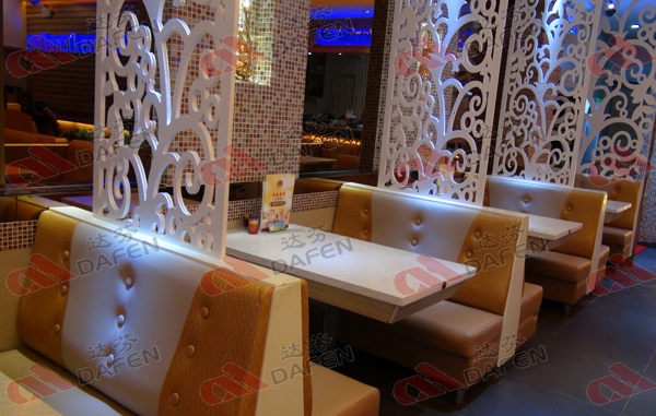 达芬的卡座沙发采用的是耐磨皮革做成的, 比普通皮革使用寿命长2-3倍,质量比同类厂家好很多,拥有既不易损坏,免去家具更新之不便,又能提高餐厅整体形象的家具。