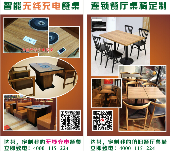 对于达芬餐厅家具公司生产的无线充电餐桌来说,很多餐厅老板都会认为需要在每个桌子下面或者其他地方引入电源会无形中增加餐厅装修时的麻烦及成本费用,但是现在的智能家具及互联网+对人们的影响所带来的便捷,就好像当年通讯界的王牌“诺基亚”遇到智能手机的冲击也是那么的不堪一击。目前餐饮品牌众多,你是属于前者还是像当初的智能手机一样成为众多品牌的一匹黑马达芬餐厅家具将助您一臂之力!