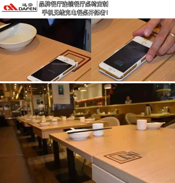 基于此,达芬家具发明了一款无线充电器餐桌,将无线充电模块集成到桌子上,给手机等移动设备进行非接触式无线充电。